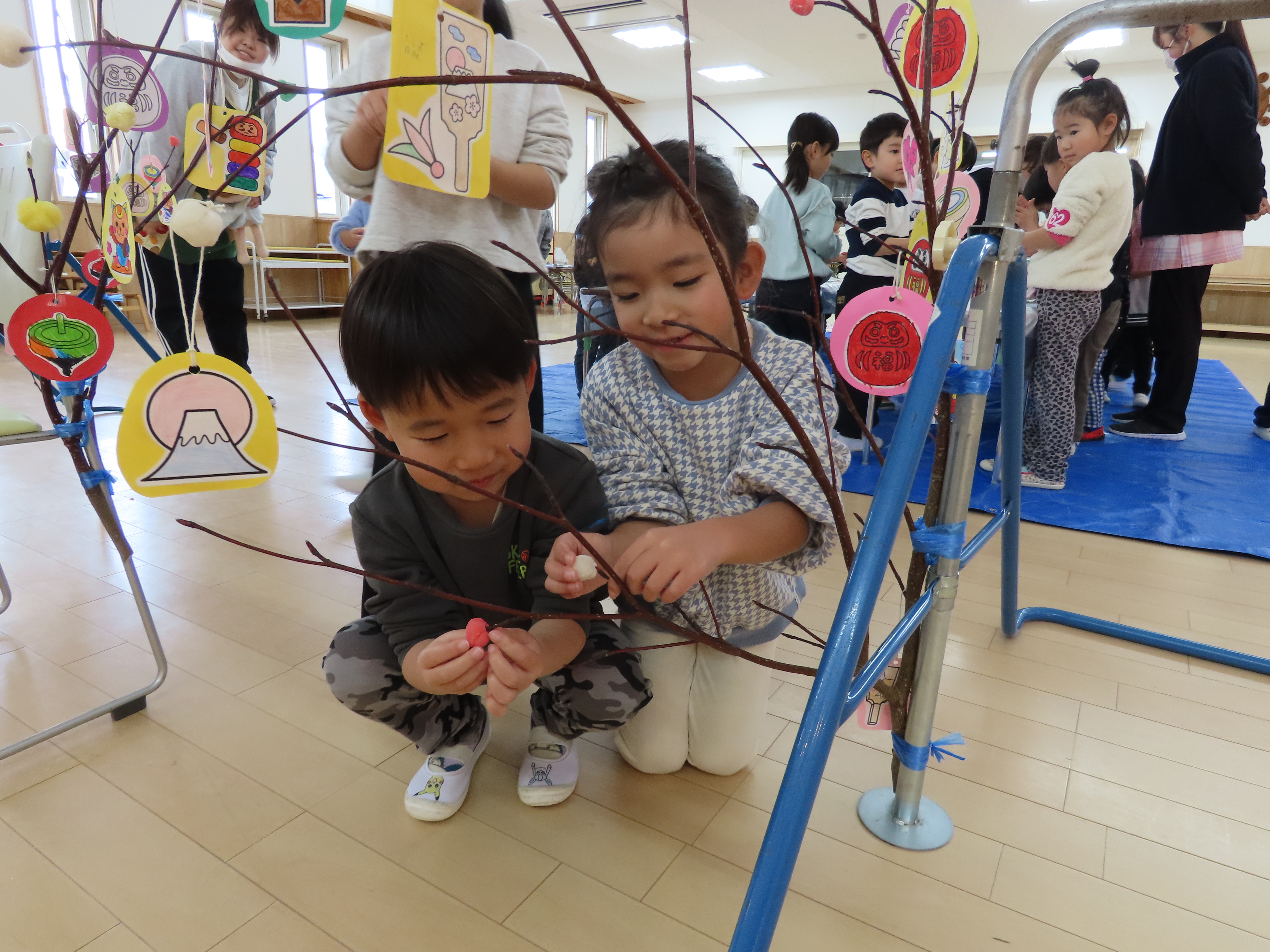 本日、小正月の伝統行事「だんごさし」を行いました。ミズキの枝に子どもたち一人ひとりが「元気に過ごせますように」と願いを込めて、色とりどりの団子や塗り絵をしたものを飾りました。支援センターでも、ご家族で伝統行事に触れ、楽しい時間を過ごしていただきました。